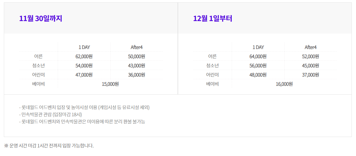 롯데월드 어드벤처 종합이용권/ 파크이용권 구매시 ~3시간 까지 무료 , 3시간 이후 10분마다 1,000원씩 부과