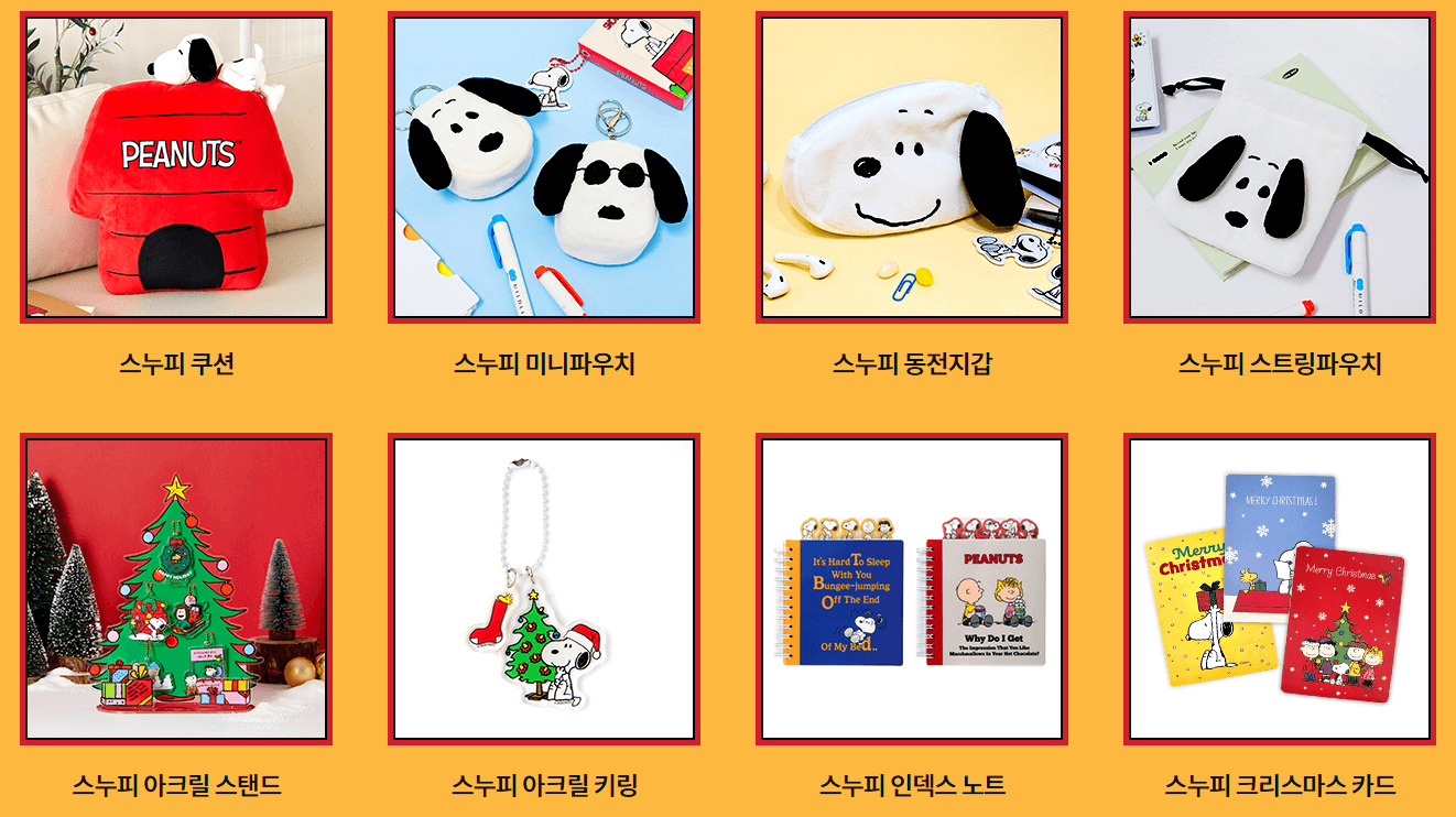 스누피와 콜라보하여 다양한 간식과 기념품을 만나볼 수 있습니다.