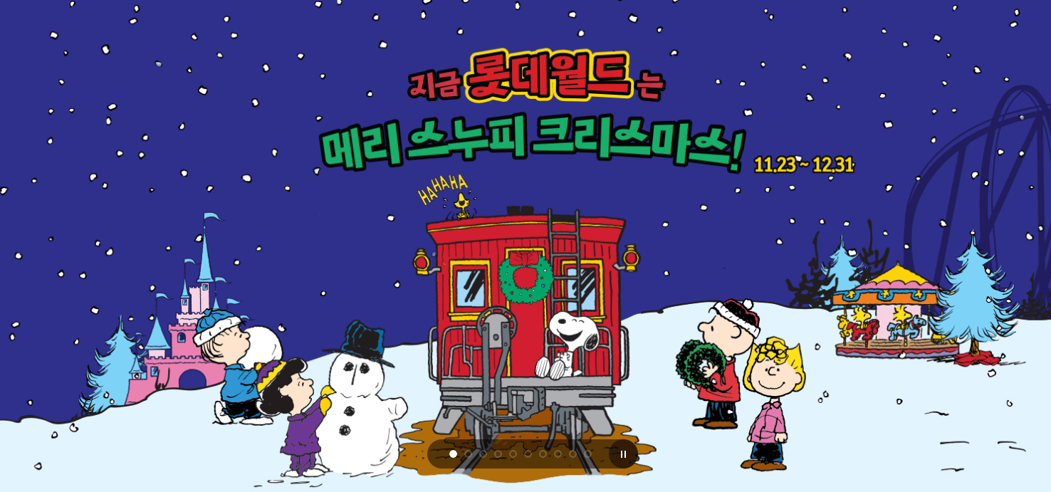 지금 롯데월드는 메리스누피 크리스마스 축제를 진행중입니다. 스누피와 친구들이 롯데월드에 놀러 왔어요. 롯데월드에서 즐거운 크리스마스를 보내는 피너츠 친구들의(스누피, 찰리브라운, 라이너스, 루시, 샐리, 리런 등) 모습을 어드벤처 곳곳에서 만나볼 수 있습니다.